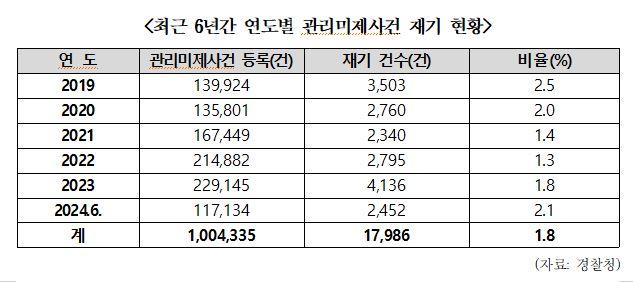 ¹Ý¸é, °ü¸®¹ÌÁ¦»ç°Ç µî·Ï °Ç Áß ¿©ÁË ¼ö»ç³ª Áõ°Å¹° Àç°¨Á¤ µîÀ¸·Î ÇÇÀÇÀÚ°¡ ƯÁ¤µÇ¾î Àç±â ÀýÂ÷¸¦ ¹âÀº »ç°ÇÀº 2019³âºÎÅÍ 2024³â 6¿ù±îÁö 1¸¸ 7,986°ÇÀ̾ú´Ù. ÀÌ ±â°£ Àüü ¹ÌÁ¦»ç°Ç µî·Ï °Ç¼ö ´ëºñ 1.8%¿¡ ºÒ°úÇÑ ¼öÄ¡´Ù.