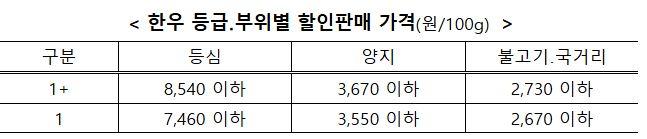 ÇÒÀÎÆÇ¸Å °¡°ÝÀº 1µî±Þ ±âÁØÀ¸·Î µî½ÉÀÇ °æ¿ì 7,460¿ø/100g, ¾çÁöÀÇ °æ¿ì 3,550¿ø/100g, ±×¹Û¿¡ ºÒ°í±â․±¹°Å¸®´Â 2,670¿ø/100g ÀÌÇÏ·Î ÆÇ¸ÅµÇ¸ç, ÀÌ´Â Áö³ÇØ °°Àº ±â°£(`23.10¿ù Çϼø) ¼ÒºñÀÚ°¡°Ý°ú ºñ±³ÇÏ´õ¶óµµ ÃÖ¼Ò 20~30% Àú·ÅÇÑ ¼öÁØ((µî½É) 20.6%¡é, (¾çÁö) 30.0%¡é, (ºÒ°í±â․±¹°Å¸®) 31.7%¡é )ÀÌ´Ù.
