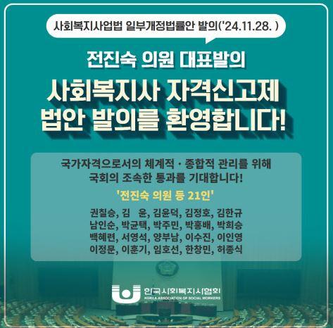 À̹ø °³Á¤¾ÈÀ» ´ëÇ¥ ¹ßÀÇÇÑ ±¹È¸ º¸°Çº¹ÁöÀ§¿øÈ¸ ÀüÁø¼÷ ÀÇ¿ø(´õºÒ¾î¹ÎÁÖ´ç, ±¤ÁÖ ºÏ±¸À»)Àº ¡°»çȸº¹Áö»ç´Â ¿ì¸®³ª¶ó º¹Áö¼ºñ½ºÀÇ Å« ÃàÀ» ´ã´çÇϰí ÀÖ´Â Àü¹®°¡¡±¶ó°í ¸»ÇÏ¸ç ¡°À̹ø °³Á¤¾ÈÀÌ »çȸº¹Áö»ç ÀÚ°ÝÀÇ Ã¼°èÀûÀÎ °ü¸®¸¦ À§ÇÑ ¹ýÀû Åä´ë°¡ µÉ °ÍÀ̸ç, »çȸº¹Áö¼ºñ½ºÀÇ Àü¹®¼º°ú ÁúÀÌ ÇÑÃþ °ÈµÉ °ÍÀ¸·Î ±â´ëµÈ´Ù¡±°í ÀüÇß´Ù.