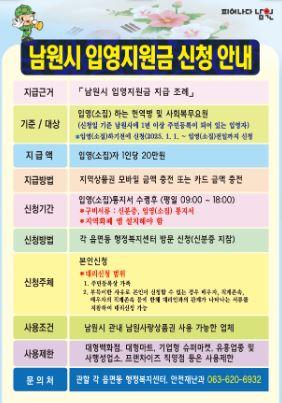 Áö±Þ ´ë»óÀº ÀÔ¿µ(¼ÒÁý) ¿¹Á¤ÀÎ Çö¿ª ¹× »çȸº¹¹«¿ä¿øÀ̸ç, ½ÅûÀÏ ±âÁØ ³²¿ø½Ã¿¡ 1³â ÀÌ»ó °è¼ÓÇÏ¿© ÁÖ¼Ò¸¦ µÎ°í °ÅÁÖÇÑ ³²¿ø½Ã¹Î Áß 2025³â 1¿ù 1ÀÏ ÀÌÈÄ ÀÔ¿µÀÚÀÌ´Ù. ½ÅûÀº ÀÔ¿µÅëÁö¼ ¼ö·ÉÀϷκÎÅÍ ÀÔ¿µÀÏ Àü±îÁö ½ÅºÐÁõ°ú ÀÔ¿µÅëÁö¼¸¦ °¡Áö°í °üÇÒ ÁÖ¼ÒÁö ÇàÁ¤º¹Áö¼¾ÅÍ¿¡ ¹æ¹®ÇØ ½ÅûÇÏ¸é µÈ´Ù.