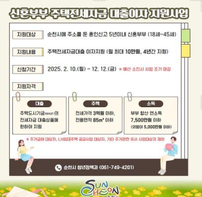 ½ÅÈ¥ºÎºÎ ÁÖÅÃÀü¼¼ÀÚ±Ý ´ëÃâÀÌÀÚ Áö¿ø»ç¾÷Àº ¼øÃµ½Ã¿¡ °ÅÁÖÇÏ´Â ¹«ÁÖÅà ½ÅÈ¥ºÎºÎ¿¡°Ô Àü¼¼ÀÚ±Ý ´ëÃâÀÌÀÚ¸¦ ¿ù 10¸¸ ¿ø¾¿ ÃÖ´ë 4³â°£ Áö¿øÇÏ´Â »ç¾÷ÀÌ´Ù.