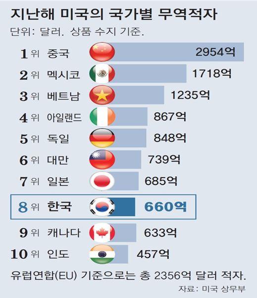 Æ®·³ÇÁ ´ëÅë·ÉÀÌ ¹«¿ªÀûÀÚ ¹®Á¦¸¦ °Á¶Çϴµ¥ Áö³ÇØ ¹Ì±¹ÀÇ ¹«¿ªÀûÀÚ´Â 9,184¾ï ´Þ·¯¿¡ ´ÞÇÏ¿© ¿ª´ë ÃÖ´ë ±Ô¸ðÀ̸ç Áß±¹Àº 2,954¾ï´Þ·¯À̸ç Çѱ¹Àº ¹Ì±¹À» »ó´ë·Î 660¾ï ´Þ·¯ÀÇ ¹«¿ªÈæÀÚ¸¦ ±â·ÏÇÔÀ¸·Î½á, Æ®·³ÇÁ ´ëÅë·ÉÀÌ Çѱ¹¿¡ ´ëÇÑ °ü¼¼ ºÎ°ú¸¦ °í·ÁÇÒ °¡´É¼ºÀÌ ³ô¾ÆÁö°í ÀÖ´Ù.