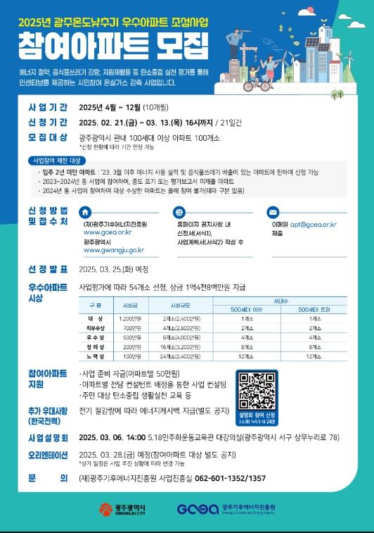 ¸ðÁý ´ë»óÀº ±¤ÁÖÁö¿ª 100¼¼´ë ÀÌ»ó °øµ¿ÁÖÅà 100°³¼Ò´Ù. Âü¿©¾ÆÆÄÆ®´Â ÁֹεéÀÌ ¿¡³ÊÁö Àý¾à, À½½Ä¹°¾²·¹±â °¨·® µî ¿Â½Ç°¡½º °¨ÃàÀ» À§ÇØ ³ë·ÂÇØ¾ß ÇÑ´Ù. ¶Ç ³ì»ö ÁְŠȯ°æ Á¶¼º µî ź¼ÒÁ߸³ »ýȰ ½Çõ Ȱµ¿À» ÃßÁøÇØ¾ß ÇÑ´Ù.