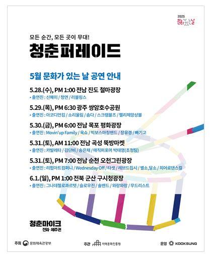±× ¿Ü¿¡µµ 5¿ù ûÃḶÀÌÅ© Àü¶ó±Ç °ø¿¬Àº Áö¿ªÀÇ °³¼º°ú °ø°£ÀÇ Æ¯»öÀ» »ì¸° ´Ùä·Î¿î ¹«´ë·Î À̾îÁø´Ù. 5¿ù 28ÀÏ(¼ö) Àü³² Áøµµ ö¸¶±¤Àå¿¡¼´Â ÀüÅë°ú ûÃáÀÌ ¾î¿ì·¯Áö´Â ¹«´ë ¡®Çѳ·ÀÇ Ã»Ãádz·ù¡¯°¡ ÆîÃÄÁö¸ç, 5¿ù 29ÀÏ(¸ñ)¿¡´Â ±¤ÁÖ ½Ö¾ÏÈ£¼ö°ø¿ø¿¡¼ ½Ã¹ÎÂü¿©Çü ÇÇÅ©´Ð ÄܼƮ ¡®Ã»Ãá Ç÷¹À̸®½ºÆ®!¡¯°¡ ÁøÇàµÇ°í, 5¿ù 30ÀÏ(±Ý) ¸ñÆ÷ Æòȱ¤Àå¿¡¼´Â ¡®Ã»Ãá ON AIR¡¯¶ó´Â À̸§ ¾Æ·¡, ¿ªµ¿ÀûÀÌ°í ¿¡³ÊÁö ³ÑÄ¡´Â ÆÛÆ÷¸Õ½º Áß½ÉÀÇ ¹«´ë°¡ °ü°´ÀÇ ¸ôÀÔÀ» ²ø¾î³¾ ¿¹Á¤ÀÌ´Ù.