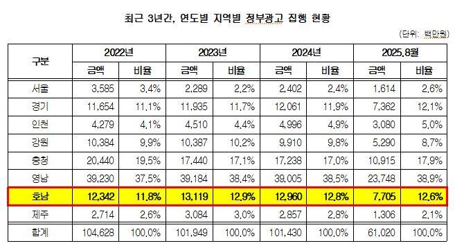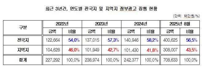 ±¹È¸ ¹®ÈüÀ°°ü±¤À§¿øÈ¸ ¹ÎÇü¹è ÀÇ¿ø(´õºÒ¾î¹ÎÁÖ´ç, ±¤ÁÖ ±¤»êÀ»)ÀÌ Çѱ¹¾ð·ÐÁøÈïÀç´ÜÀ¸·ÎºÎÅÍ Á¦Ãâ¹ÞÀº ¡®ÃÖ±Ù 3³â°£(2022~2024³â) Àü±¹Áö ¹× Áö¿ªÁö Á¤ºÎ±¤°í ÁýÇà ÇöȲ¡¯¿¡ µû¸£¸é, Áö¿ªÁö ±¤°í ÁýÇà¾×Àº ¸Å³â °¨¼Ò¼¼¸¦ º¸¿´´Ù. 2022³â Áö¿ªÁö¿¡ ÅõÀÔµÈ Á¤ºÎ±¤°í´Â ÀüüÀÇ 46.0%·Î 1,046¾ï 2,800¸¸ ¿øÀ̾úÀ¸³ª, 2023³â¿¡´Â 42.7%(1,019¾ï 4,900¸¸ ¿ø), 2024³â¿¡´Â 41.8%(1,014¾ï 3,000¸¸ ¿ø)·Î ÁÙ¾îµé¾ú´Ù. 3³â »õ 4.2% °¨¼ÒÇÑ ¼öÄ¡´Ù.