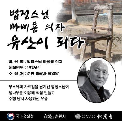 ¡®¹ýÁ¤½º´Ô ºü»ß¿ë ÀÇÀÚ¡¯´Â ½º´ÔÀÌ 1976³â ¼øÃµ ¼Û±¤»ç ºÒÀϾϿ¡¼ ¶ª°¨¿ë ³ª¹«¸¦ ´Ùµë¾î Á÷Á¢ ¸¸µç ³ª¹« ÀÇÀÚ·Î, °Ë¼ÒÇÑ ¼öÇàÀÚÀÇ »îÀ» »ó¡ÇÏ´Â À¯»êÀÌ´Ù. ¡®ºü»ß¿ë¡¯À̶ó´Â À̸§Àº ¿µÈ ºü»ß¿ëÀÇ ÁÖÀΰøÀÌ ¿Üµý¼¶¿¡ °¤Çô ÀλýÀ» ³¶ºñÇÑ °Í¿¡ ºñÃß¾î, ÀÌ ÀÇÀÚ¿¡ ¾É¾Æ ½º½º·ÎÀÇ ¼öÇà°ú °íµ¶À» ¼ºÂûÇÏ´Â Àǹ̰¡ ´ã°Ü ÀÖ´Ù.