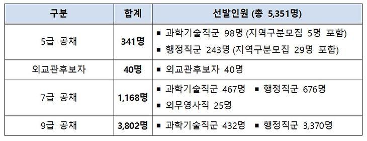 ÀÌ¿¡ Á÷±Þº° ¼±¹ßÀοøÀº 5±Þ 341¸í¡¤¿Ü±³°üÈĺ¸ÀÚ 40¸í¡¤7±Þ 1168¸í(±Ù·Î°¨µ¶¡¤»ê¾÷¾ÈÀü ºÐ¾ß 500¸í Æ÷ÇÔ)¡¤9±Þ 3802¸íÀ¸·Î, ¿À´Â 3¿ù¿¡ 5±Þ ¹× ¿Ü±³°üÈĺ¸ÀÚ ¼±¹ß½ÃÇèºÎÅÍ ½ÃÀÛÇÑ´Ù.