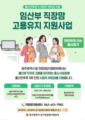 [´ëÇÑ¿©¼ºÀϺ¸ = ±è¼ø´ö ±âÀÚ] ±¤ÁÖ±¤¿ª½Ã Àϰ¡Á¤¾ç¸³Áö¿øº»ºÎ´Â ÀÓ»êºÎ ±Ù·ÎÀÚÀÇ Ãâ»ê ÀüÈÄ ÈÞ°¡ µî¿¡ µû¸¥ ºÎ´ã±ÝÀ» Áö¿øÇÏ´Â ¡®ÀÓ»êºÎ Á÷À帾 °í¿ëÀ¯Áö Áö¿ø»ç¾÷¡¯ ´ë»ó »ç¾÷ÀåÀ» ¿À´Â 10ÀϺÎÅÍ ¼±Âø¼ø ¸ðÁýÇÑ´Ù.