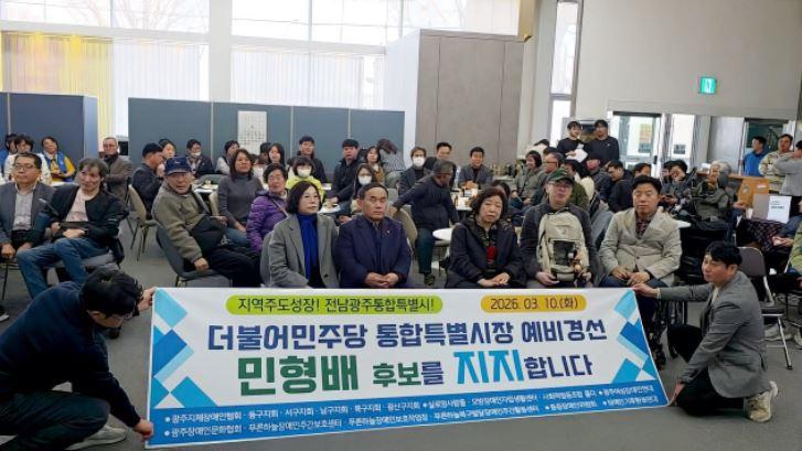 ±¤ÁÖÁöüÀå¾ÖÀÎÇùȸ, ±¤ÁÖÀå¾ÖÀι®ÈÇùȸ µî ±¤ÁÖÁö¿ª Àå¾ÖÀδÜüµéÀº À̳¯ ÁöÁö ¼±¾ð¹®À» ÅëÇØ ¡°Àü³²¡¤±¤ÁÖ ÅëÇÕÆ¯º°½Ã´Â ´Ü¼øÇÑ ÇàÁ¤ ÅëÇÕÀÌ ¾Æ´Ï¶ó ½Ã¹ÎÀÇ »îÀ» ´õ ³ªÀº ¹æÇâÀ¸·Î ¹Ù²Ù´Â À§´ëÇÑ µµÀü¡±À̶ó¸ç ¡°»çȸÀû ¾àÀÚ¸¦ Á¸ÁßÇÏ°í ¸ðµç ½Ã¹ÎÀÌ ÇÔ²² Àß »ç´Â µµ½Ã¸¦ ¸¸µé ÀûÀÓÀÚ·Î ¹ÎÇü¹è È常¦ ÁöÁöÇÑ´Ù¡±°í ¹àÇû´Ù.
