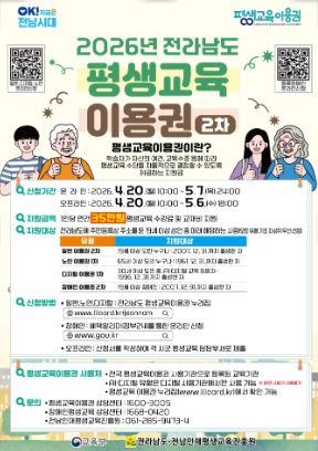 Æò»ý±³À°ÀÌ¿ë±Ç ´©¸®Áý(www.lllcard.kr/reg/jeonnam)À» ÅëÇÑ ¿Â¶óÀÎ ½ÅûÀº 5¿ù 7ÀϱîÁö °¡´ÉÇϸç, ¼øÃµ½Ã Æò»ý±³À°°ú ¹æ¹® ½ÅûÀº 5¿ù 6ÀϱîÁö Á¢¼öÇÑ´Ù.